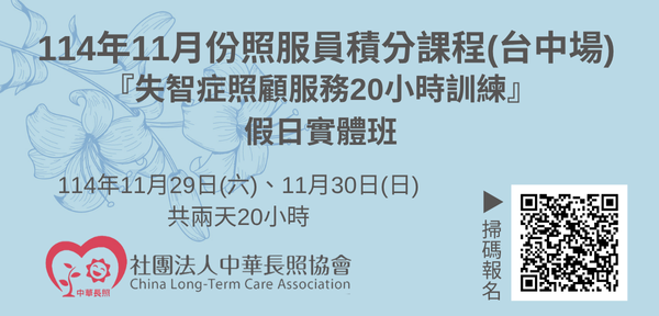 114年11月【長照積分課程】長期照顧服務人員『失智症照顧服務20小時訓練』(假日實體班-台中場)