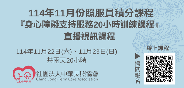 114年11月【長照積分課程】長期照顧服務人員『身心障礙支持服務20小時訓練』(線上直播課程)