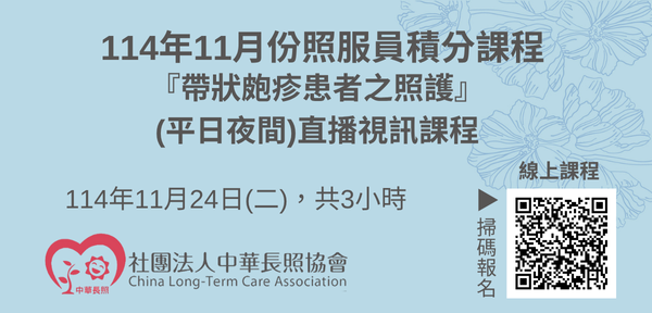 114年10月【長照積分課程】長期照顧服務人員『帶狀皰疹患者之照護』(線上直播課程)