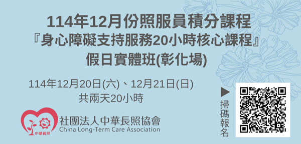 114年12月【長照積分課程】長期照顧服務人員『身心障礙支持服務20小時核心課程』(假日實體班-彰化場)