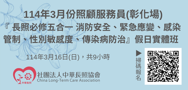 114年03月【長照積分課程】長期照顧服務人員『必修五合一消防安全、緊急應變、感染管制、性別敏感度 、傳染病防治』(假日實體班)