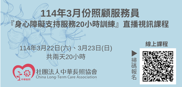 114年03月【長照積分課程】長期照顧服務人員『直播視訊課程身心障礙支持服務20小時訓練』(線上課程)
