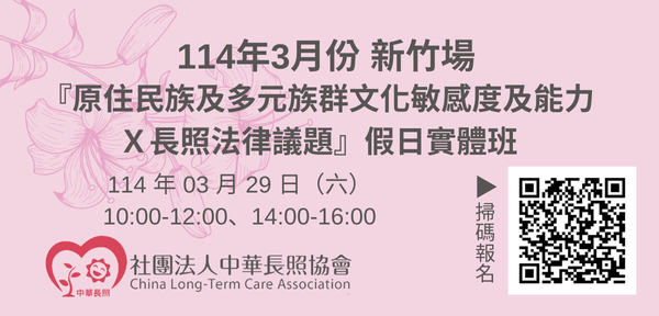 114年03月【長照積分課程】長期照顧服務人員『原住民族及多元族群文化敏感度及能力X長照法律議題』(假日實體班)