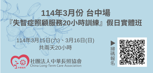 114年03月【長照積分課程】長期照顧服務人員『失智症照顧服務20小時訓練』(假日實體班)