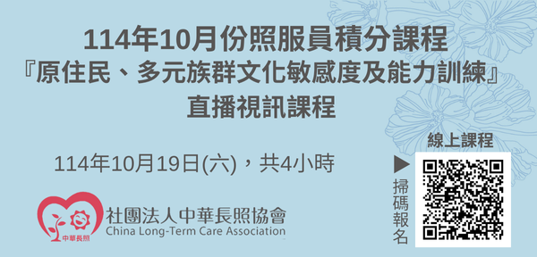 114年10月【長照積分課程】長期照顧服務人員『原住民、多元族群文化敏感度及能力訓練』(線上直播課程)