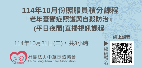 114年10月【長照積分課程】長期照顧服務人員『老年憂鬱症照護與自殺防治』(線上直播課程)