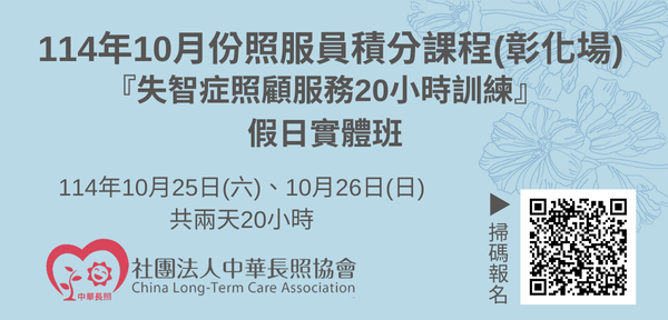 114年10月【長照積分課程】長期照顧服務人員『失智症照顧服務 20 小時訓練』(假日實體班-彰化場)