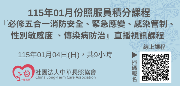 115年1月【長照積分課程】長期照顧服務人員『必修五合一消防安全、緊急應變、感染管制、性別敏感度 、傳染病防治』(線上直播課程)