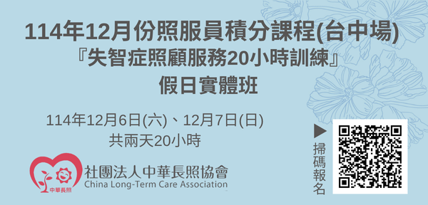 114年12月【長照積分課程】長期照顧服務人員『失智症照顧服務20小時訓練』(假日實體班-台中場)