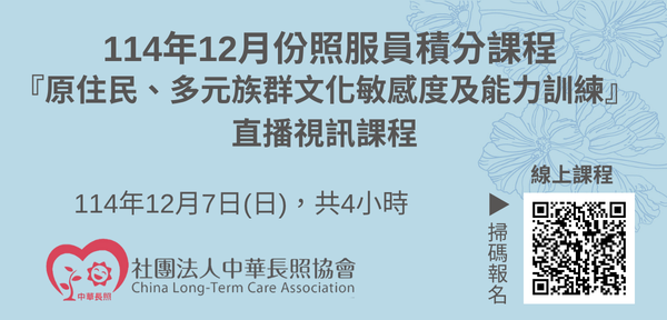 114年12月【長照積分課程】長期照顧服務人員『原住民、多元族群文化敏感度及能力訓練』(線上直播課程)
