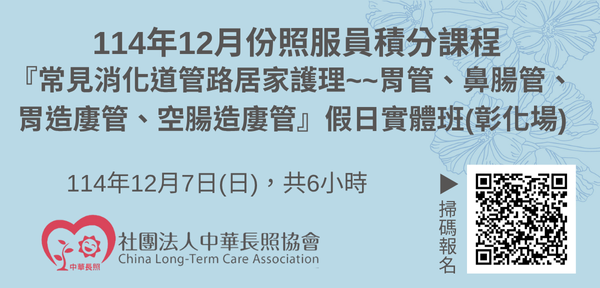 114年12月【長照積分課程】長期照顧服務人員『常見消化道管路居家護理~~胃管、鼻腸管、胃造廔管、空腸造廔管』(假日實體班-彰化場)
