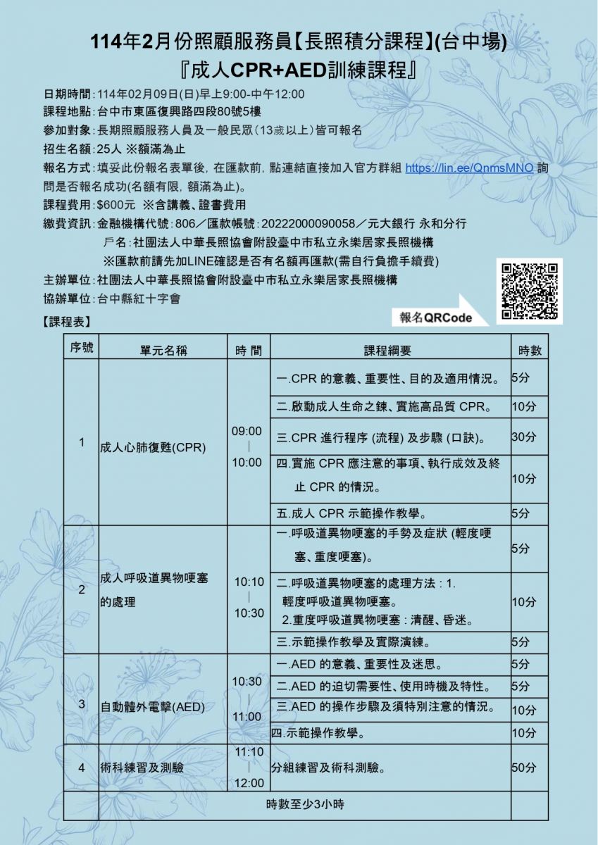 (7)全程參與且術科測驗達70分者可取得成人CPR+AED證書(此課程無長照積分)。