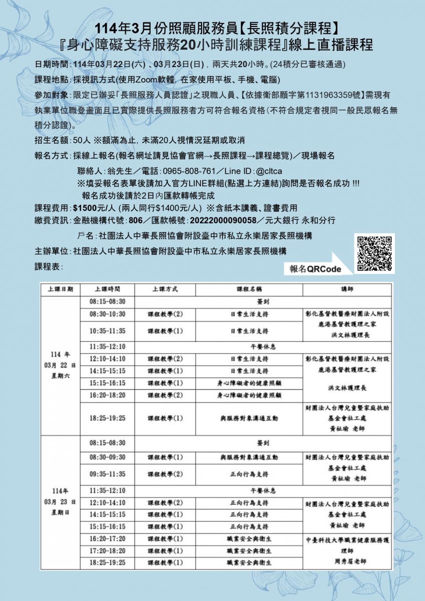 - 【依據衛部顧字第1131963359號 】:需現有執業單位職登畫面且已實際提供長照服務者方可符合報名資格(不符合規定者視同一般民眾報名無積分認證)