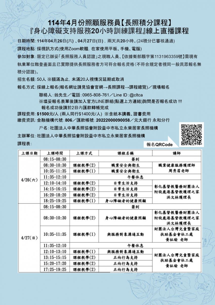 - 【依據衛部顧字第1131963359號 】:需現有執業單位職登畫面且已實際提供長照服務者方可符合報名資格(不符合規定者視同一般民眾報名無積分認證)