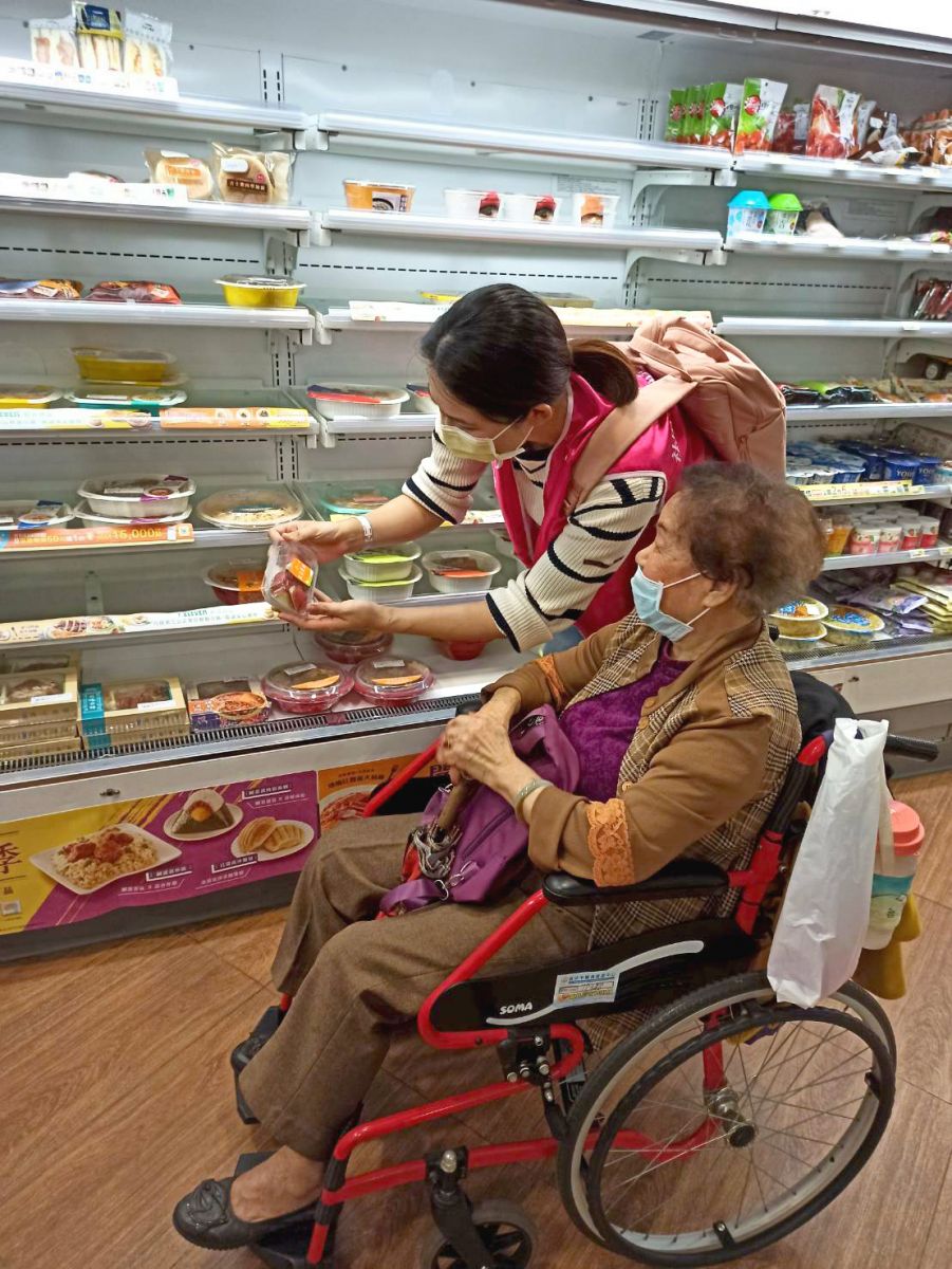 中午時間我們帶陸奶奶到樂園裡頭的便利商店逛逛,出遊當天的天氣有點濕冷,為安全起見,我們請奶奶坐著輪椅(在此要再感謝捐贈輪椅的善心民眾),帶著奶奶走走看看,陸奶奶的好心情全寫在臉上。
