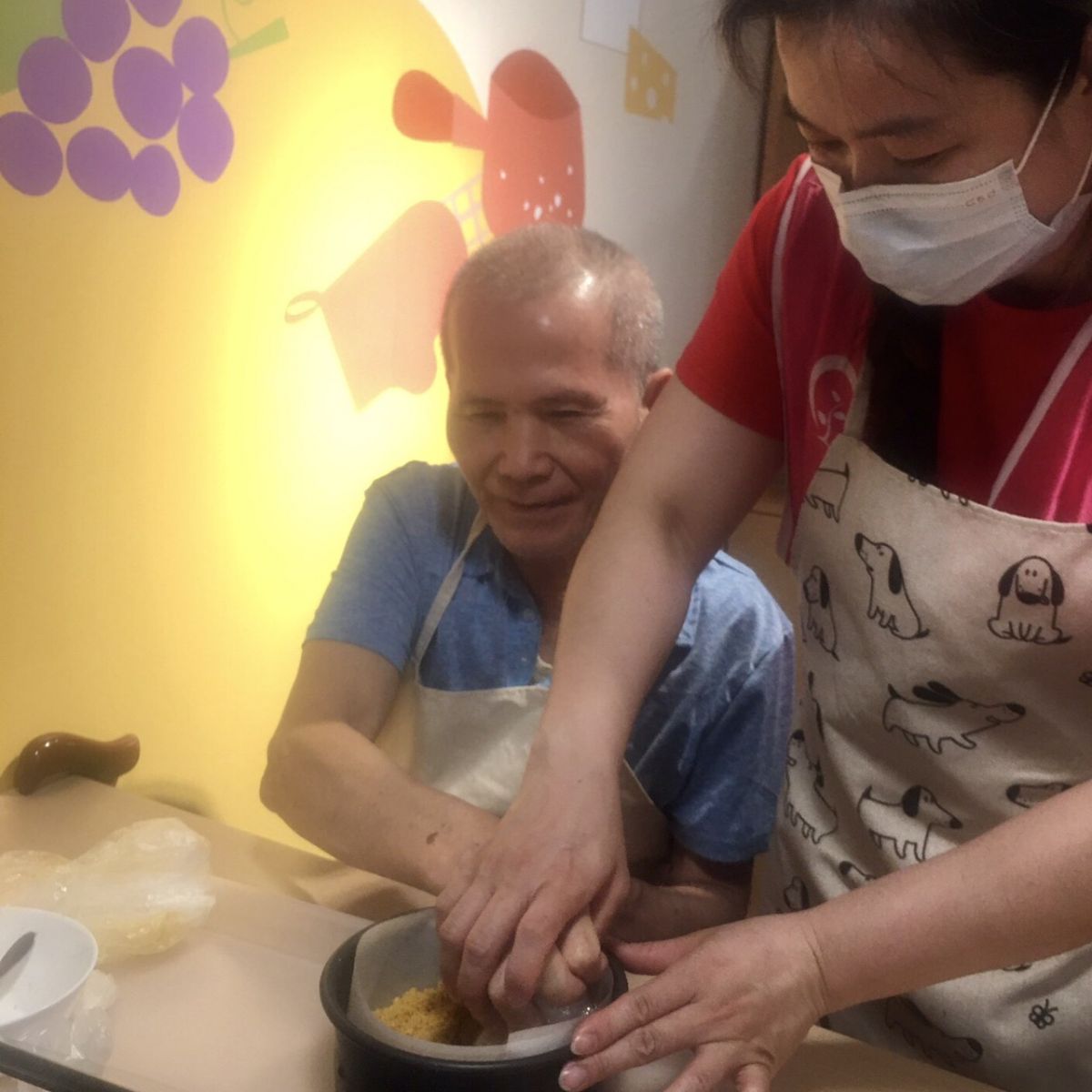 視障長輩余伯伯在一旁聽著我們算重量,數材料,洗杯碗,雖然看不見繽紛的糕點,但我們帶著余伯伯一起動手揉麵團,