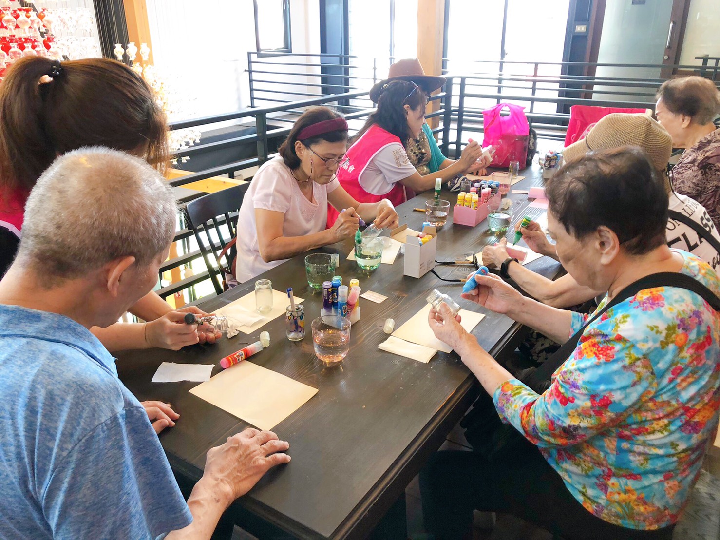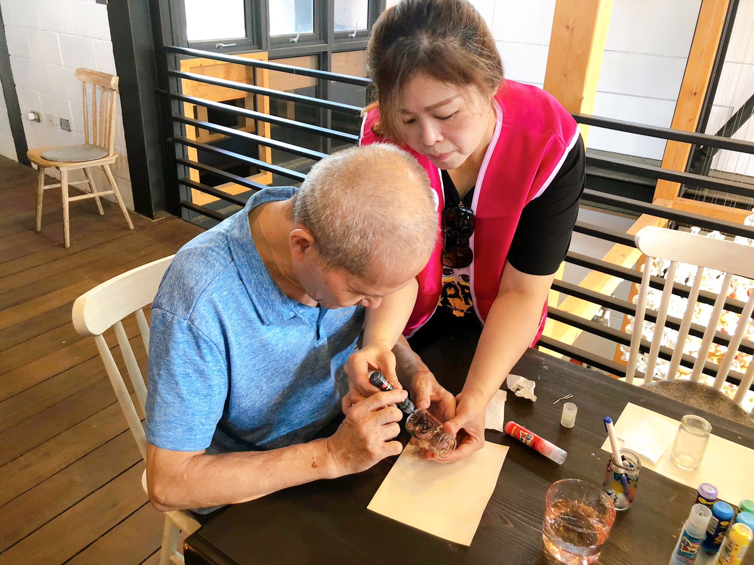 這次安排體驗手作彩繪玻璃瓶,長輩們聚精會神地塗鴉畫畫、細細製作,過程中歡樂聲不斷;待顔料完全風乾後,每個人拿到屬於自己的創作玻璃瓶時,都露出了大大的笑容。