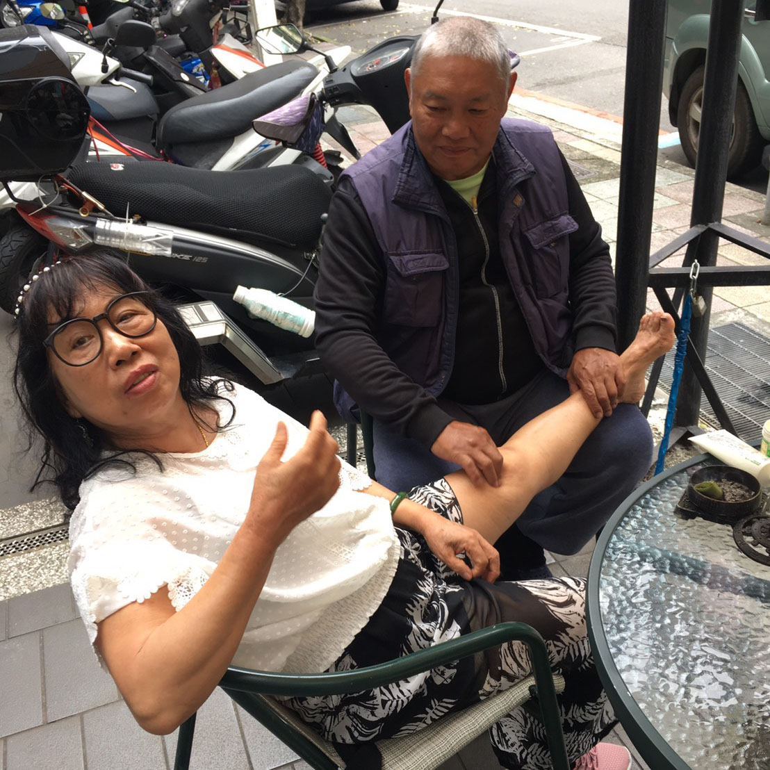 有證照的他,拿出推拿的看家本領,於是有了這一幅長輩服務長輩的可愛畫面。