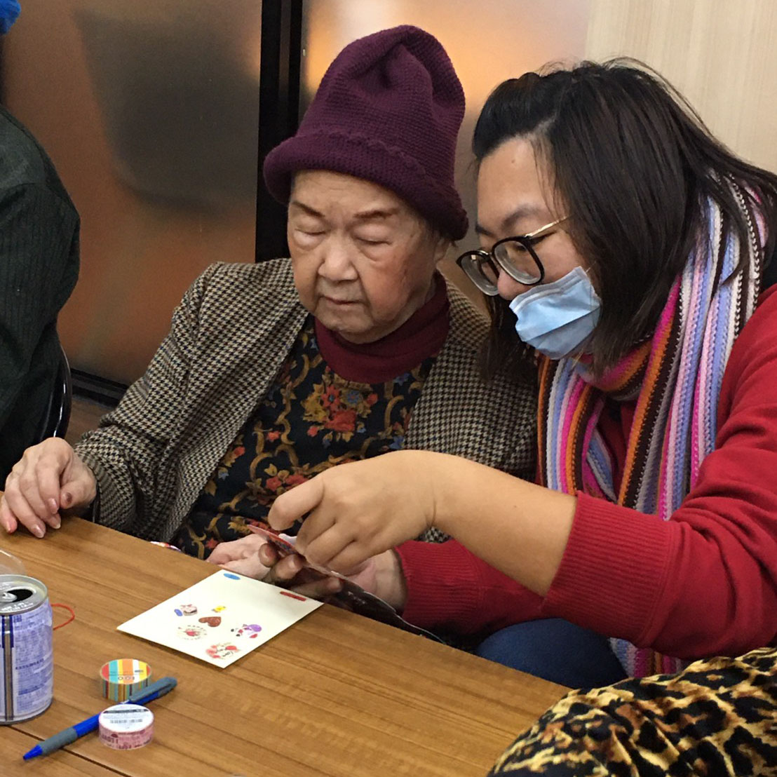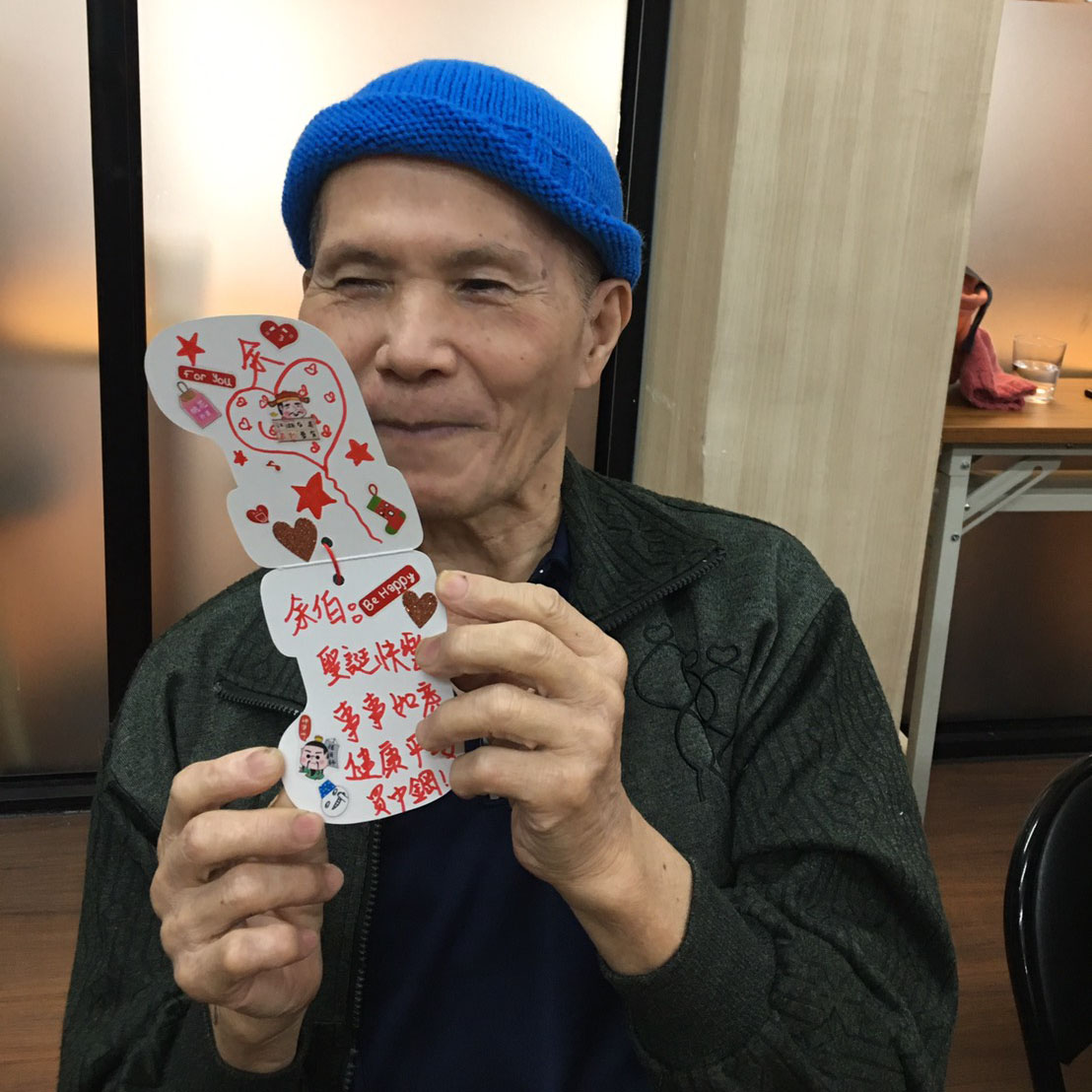 或寫下送給他人的祝福。長輩們在居服員的協助下,用心妝點著自己的卡片,讓小小的一張卡片,乘載了滿滿的心意。