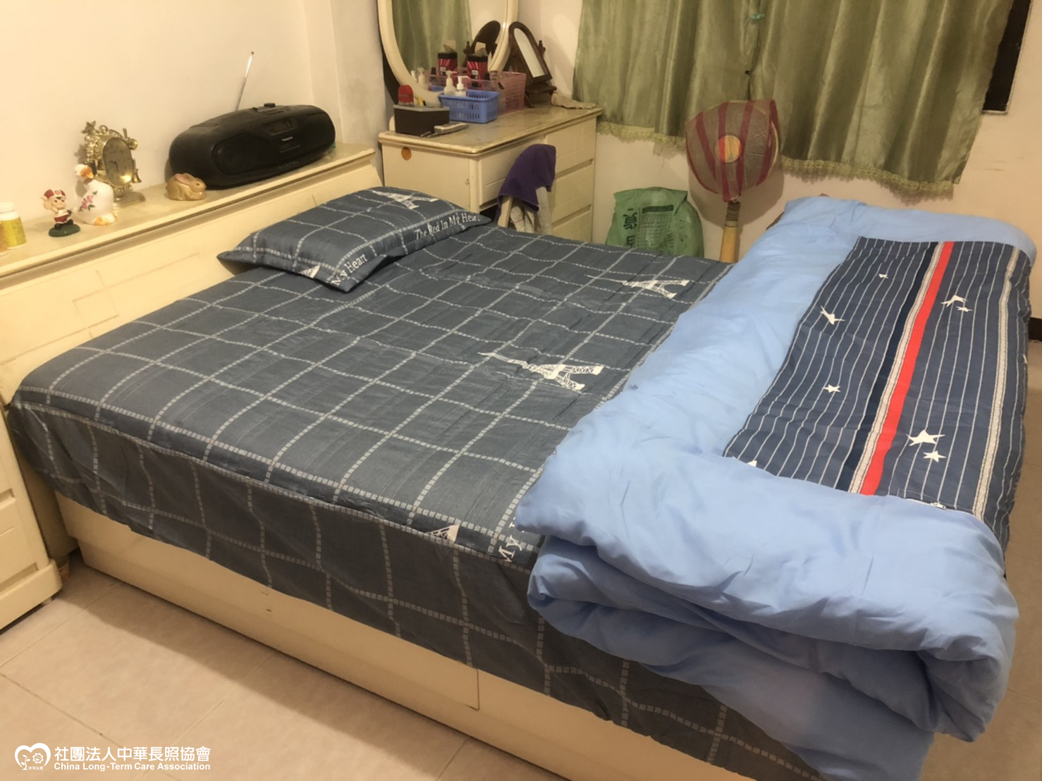 居服員擔心床包的狀況容易滋生細菌,影響長輩的健康,將這個情形反映給協會,協會立刻添購新的床包組,請居服員幫忙更換,換新後余伯伯雖然嘴巴念念有詞地說著「唉阿,浪費錢」,
