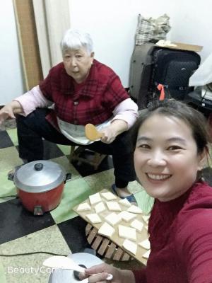 擅長製作麵食的謝奶奶上次做了槓子頭,大獲好評。這次又邀請照服員攜手桿麵做山東烙餅。從和麵到桿皮,通通自己來。照服員好奇的問奶奶沒有烤箱怎麼烤餅呢?奶奶竟然用大同電鍋來烙,真是老人家智慧,佩服佩服。
