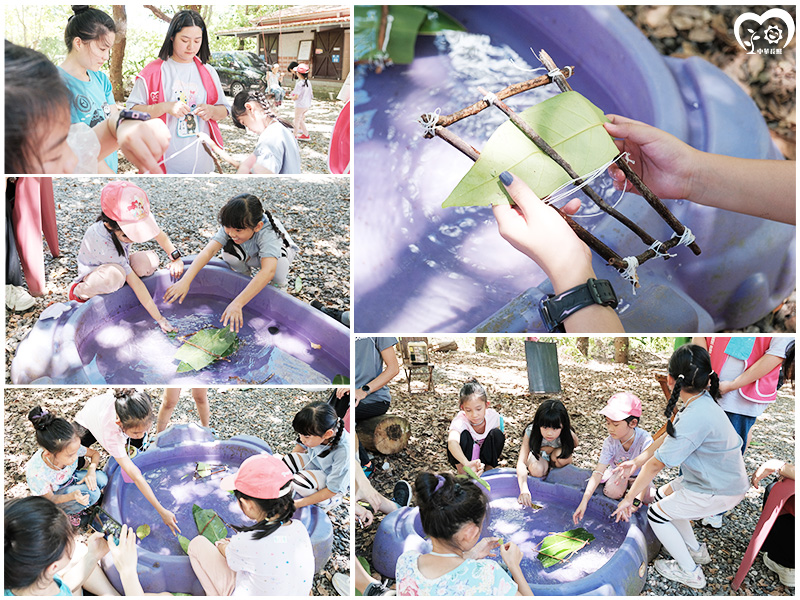 接著,這群小冒險家化身了小小造船師。我們讓孩子四處尋找營地裡的天然素材,像是樹葉、樹枝和小石頭,讓他們思考如何建造一艘能在水面上漂浮的小船。這不僅是對生態的認識,對創意的考驗。孩子們一邊討論一邊動手,當他們看到自己的小船成功漂浮在水面時,那份驕傲與成就感無法言喻,就像是親自駕駛了一艘偉大的探險船,駛向未知的彼岸。