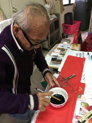 今天爺爺在我們鼓勵下又再度揮毫,架勢果然十足。年紀大了,有時會忘記字怎麼寫,但還是絞盡腦汁,揮灑出最棒的春聯。