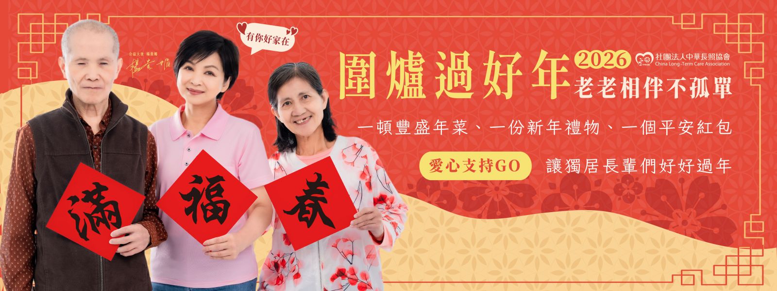 農曆新年對於獨居弱勢長輩來說,是埋藏的幸福回憶與深深的期待,一份熱騰騰的年菜、象徵祝福的年禮及紅包,團聚的歡喜氣氛,因為身體或經濟因素成了遙不可及的企盼。中華長照協會長期服務獨居長者,今年春節邀請本會認助之獨居長者外,更將對象擴大至新北地區(中永和為主)的獨居長輩,透過年節服務,讓獨居長輩能夠安心過好年。