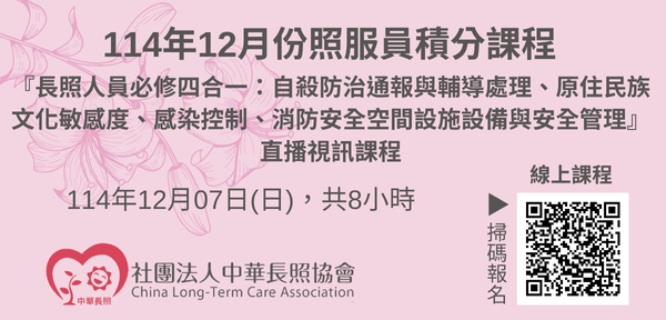 114年12月【長照積分課程】長期照顧服務人員『長照人員必修四合一積分課』(線上直播課程)