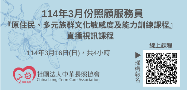 114年03月【長照積分課程】長期照顧服務人員『直播視訊課程原住民、多元族群文化敏感度及能力訓練』(線上課程)