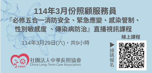 114年03月【長照積分課程】長期照顧服務人員『直播視訊課程必修五合一消防安全、緊急應變、感染管制、性別敏感度 、傳染病防治』(線上課程)