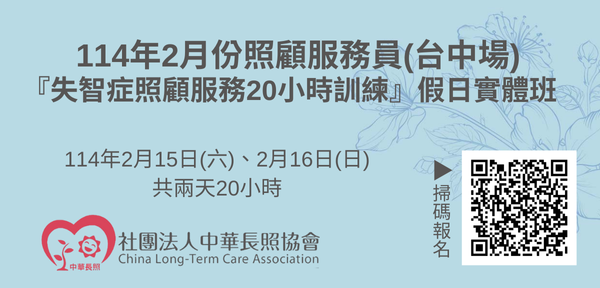 114年02月【長照積分課程】長期照顧服務人員『失智症照顧服務20小時訓練(假日實體班)』台中場