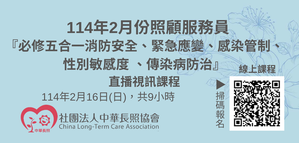 114年02月【長照積分課程】長期照顧服務人員『必修五合一消防安全、緊急應變、感染管制、性別敏感度 、傳染病防治』(線上課程)