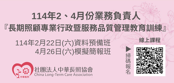 114年02月【長照積分課程】業務負責人『長期照顧專業行政暨服務品質管理教育訓練』(線上課程)