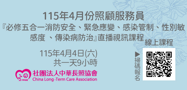 115年04月【長照積分課程】長期照顧服務人員『必修五合一消防安全、緊急應變、感染管制、性別敏感度、傳染病防治』(線上直播課程)