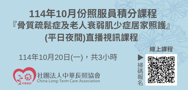 114年10月【長照積分課程】長期照顧服務人員『質疏鬆症及老人衰弱肌少症居家照護』(線上直播課程)