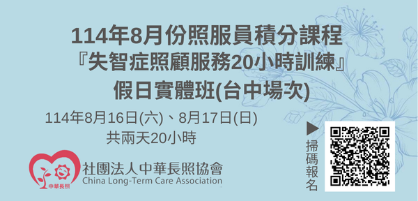 114年08月【長照積分課程】長期照顧服務人員『失智症照顧服務20小時訓練』(台中場 假日實體課程)