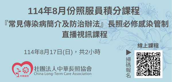 114年08月【長照積分課程】長期照顧服務人員『常見傳染病簡介及防治辦法』(線上直播課程)