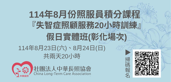 114年08月【長照積分課程】長期照顧服務人員『失智症照顧服務 20 小時訓練』(彰化假日實體課程)