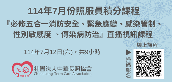 114年07月【長照積分課程】長期照顧服務人員『必修五合一消防安全、緊急應變、感染管制、性別敏感度 、傳染病防治』(線上直播課程)
