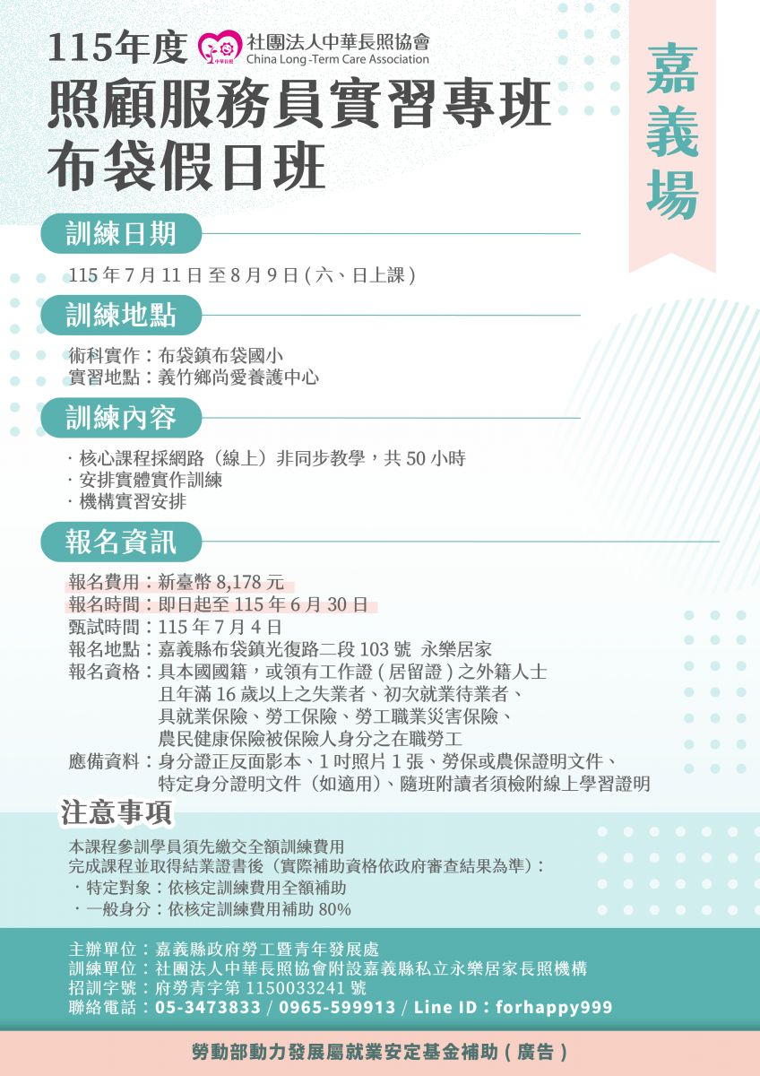 因高齡長者、身心障礙等失能個案人數不斷攀升,長期照護人力明顯供不應求,配合政府推動長照2.0計畫,促使失能個案能獲得妥善照顧及提昇照顧服務品質,本會特辦理「照顧服務員職前訓練課程」,以培育照顧專門人才投入照顧行列。期望透過課程講解、模擬教學等課程設計有助於學習專業照顧服務,以提昇照顧服務人力品質與資源,並促進就業機會,將長期照顧人力需求及照顧資源專業化與在地化。