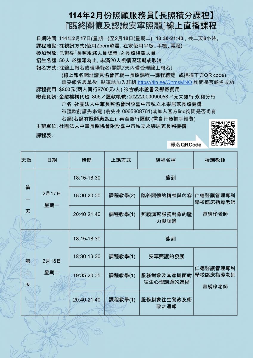 (12)不提供紙本講義,於課前2-3天提供雲端檔案自行下載。