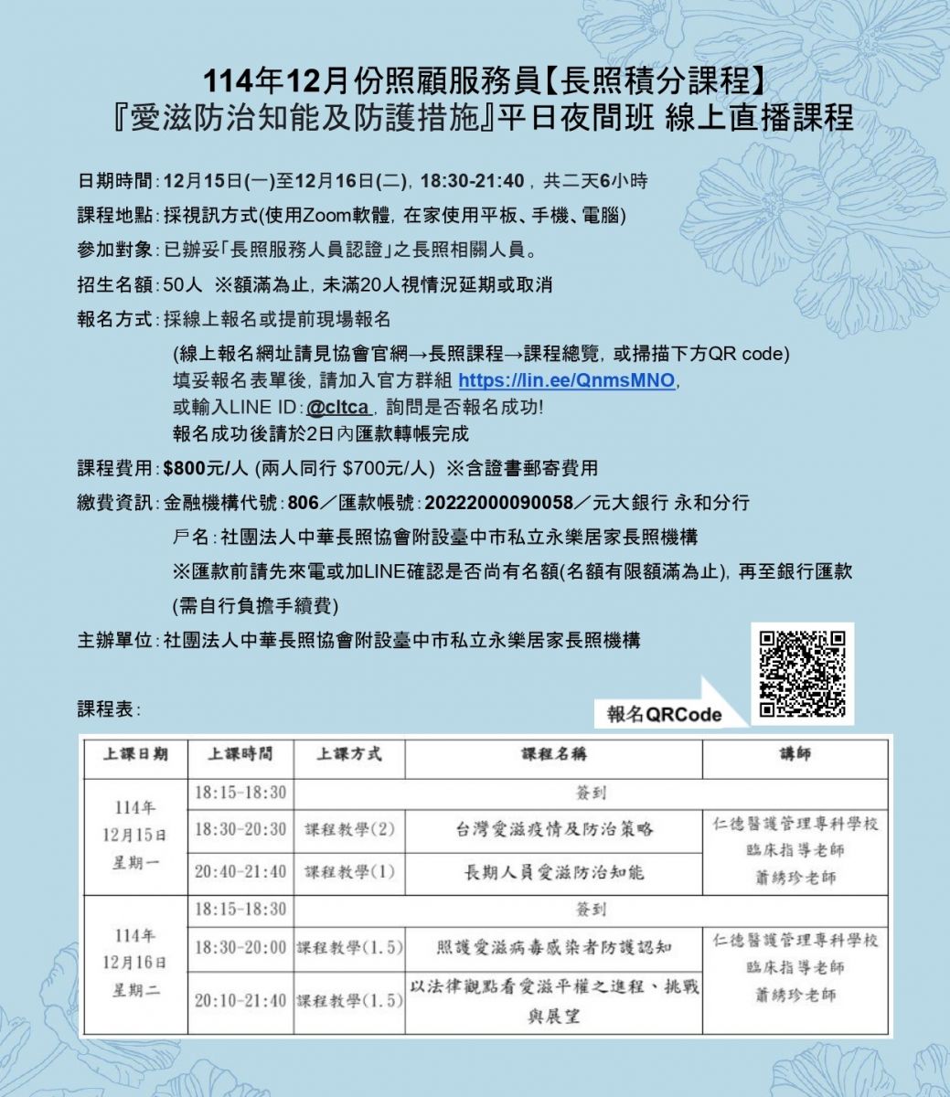(13)上課期間不得提供長照服務亦不得同時參加其他長照積分課程,如被稽核到本單位不予退費及承擔相關責任。