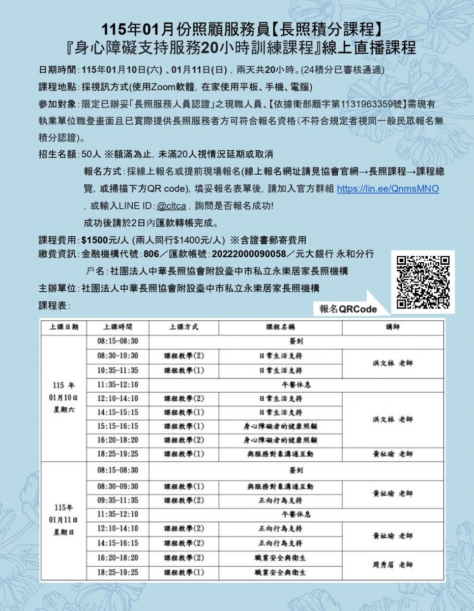 (15)【依據衛部顧字第1131963359號 】:需現有執業單位職登畫面且已實際提供長照服務者方可符合報名資格(不符合規定者視同一般民眾報名無積分認證)
